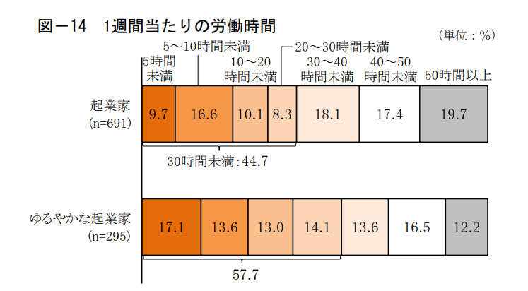 事業に係る1週間当たりの労働時間は、「5時間未満」が17.1%と最も多くなっています(図-14)。驚くほど短いですね。これは「起業を生活の一部として取り入れる」人が多いことを示しています。
