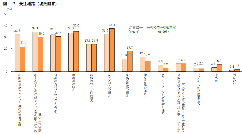 仕事の受注経路は、「友人・知人の紹介」が37.4%と最も高く、次いで「取引先の紹介」(35.0%)、「自身のSNSやブログを通じて」(30.5%)の順となっています(図-17)。改めてセールス活動をしているのではなく、元々持っているネットワークを生かしているようです。つまり、ゆる起業では新規開拓の営業よりも、既存の人脈をどう活かすかが成功のカギになります。