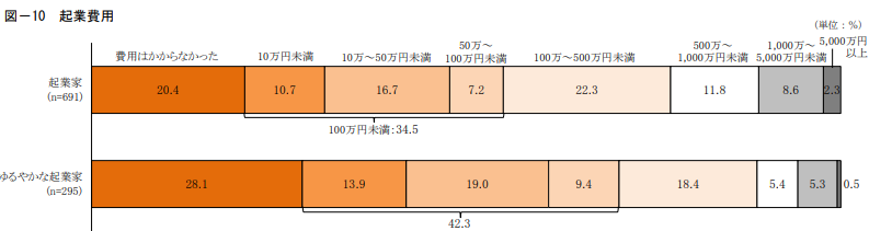 ○ 起業費用は、「かからなかった」割合が28.1%と最も高い(図-10)。「100万円未満」の割合は、42.3%とガチ起業家(34.5%)に比べて高く、少額で起業した人が多くなっています。